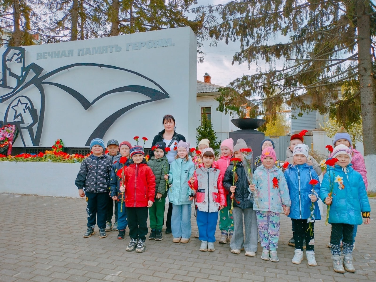 по традиции,воспитанники подготовительной группы «Жемчужинки» и старшей группы «Солнечные лучики» совершили познавательную экскурсию к мемориалу «Вечный огонь».