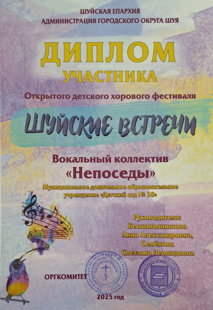 15 мая наши «Непоседы» стали участниками открытого детского хорового фестиваля и выступили в номинации вокальный коллектив с песнями «Ленинградцы» и «Идёт солдат по городу». Ребята первый раз с волнением вышли на большую сцену городского дома культуры, где был полный зал участников фестиваля и исполнили песни. Всем талантливых вокалистам были вручены дипломы и сладкие призы.