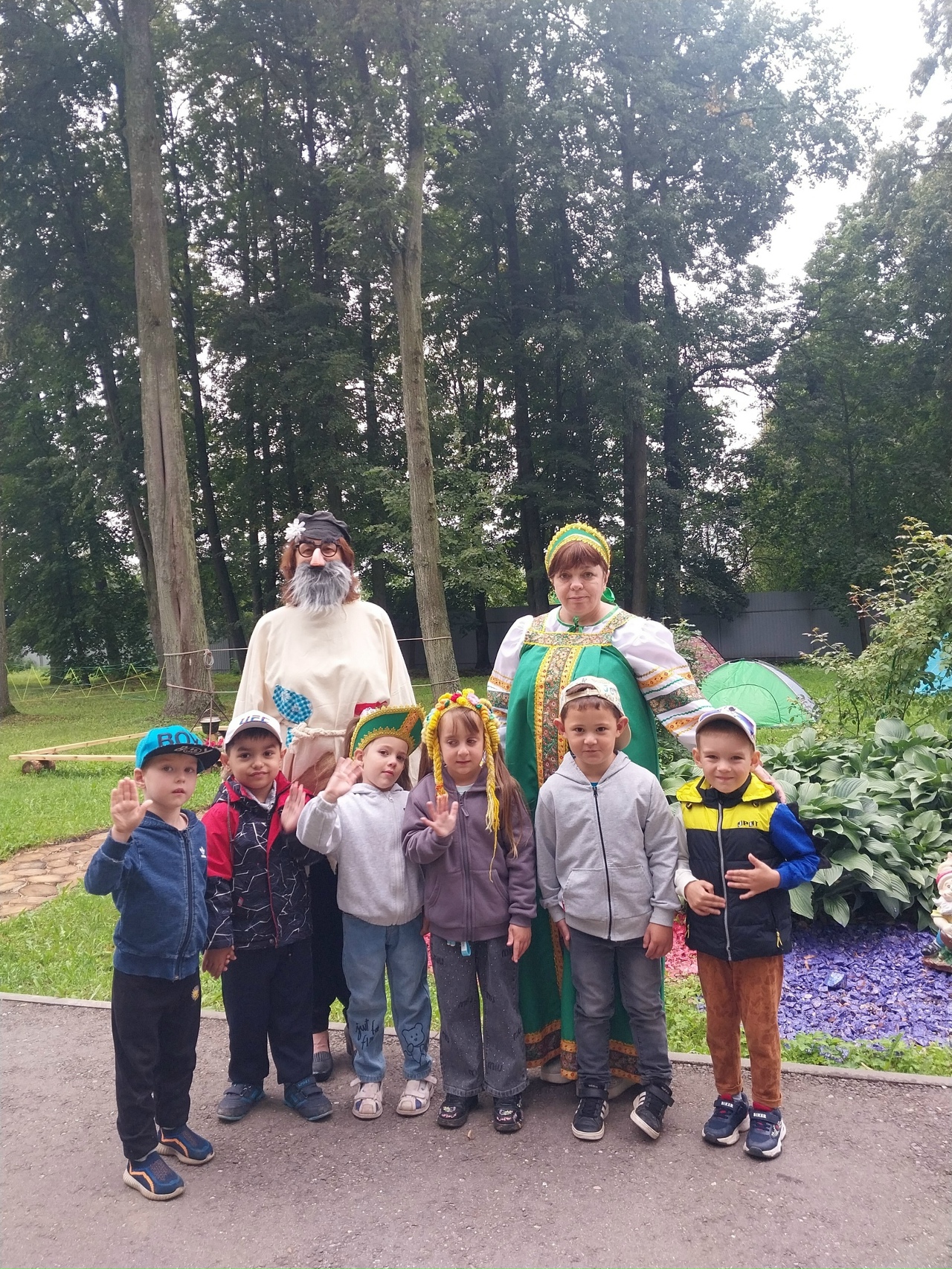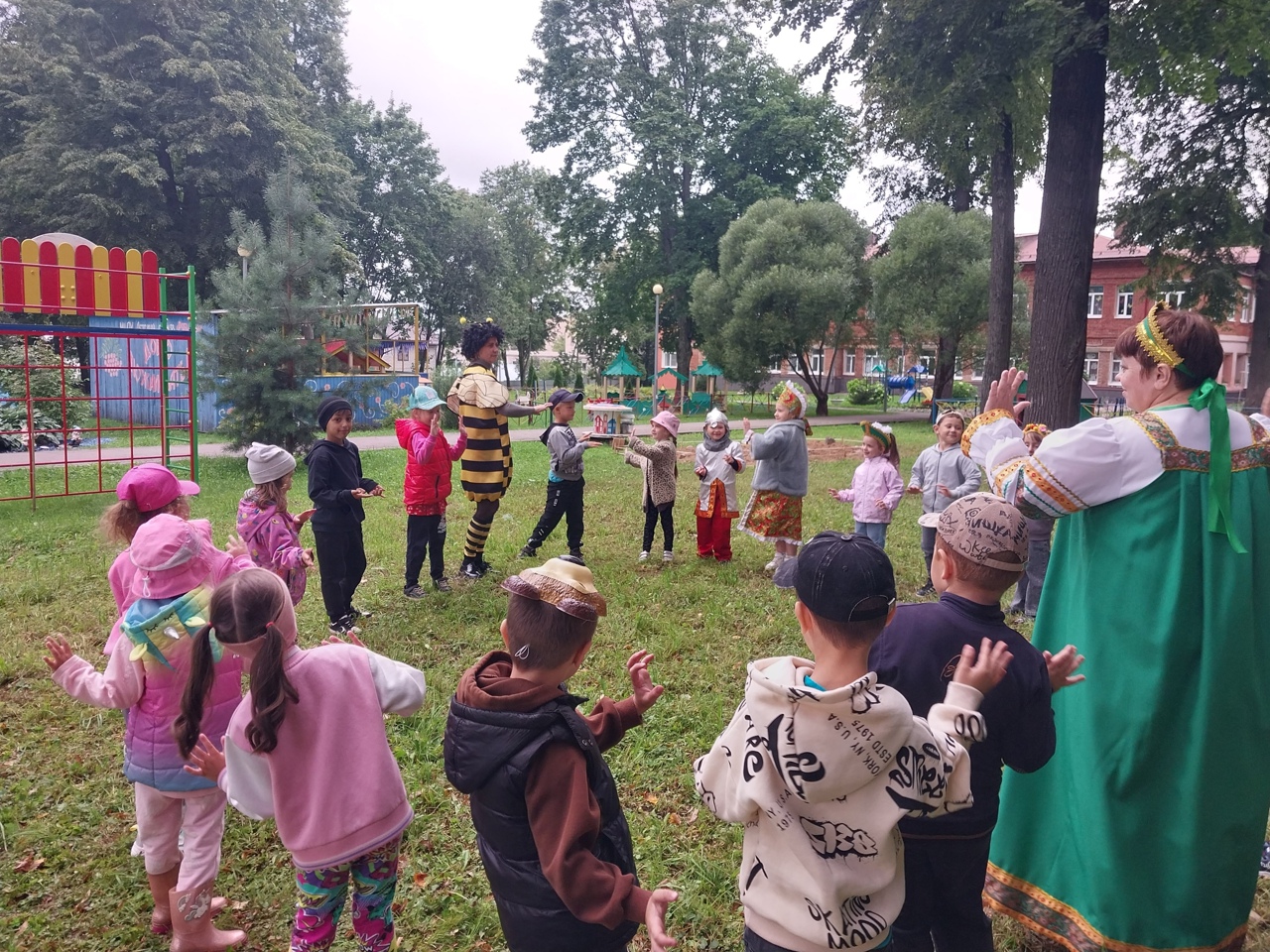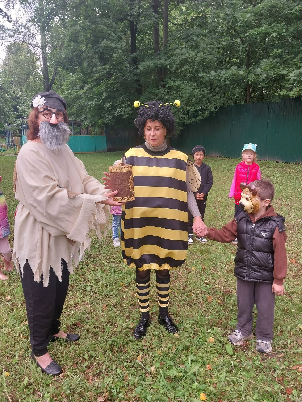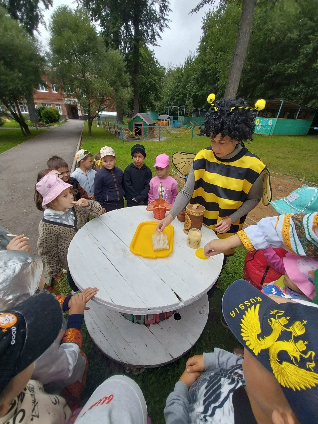 Говорят, даже сам воздух в день Первого Спаса пропитывается медовым ароматом. Весело, дружно отметили наши ребята праздник. И, конечно, Пчёлка угощала мёдом! Медовый Спас идёт — всему миру мёд!