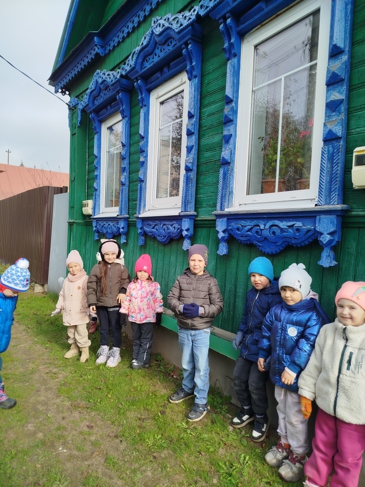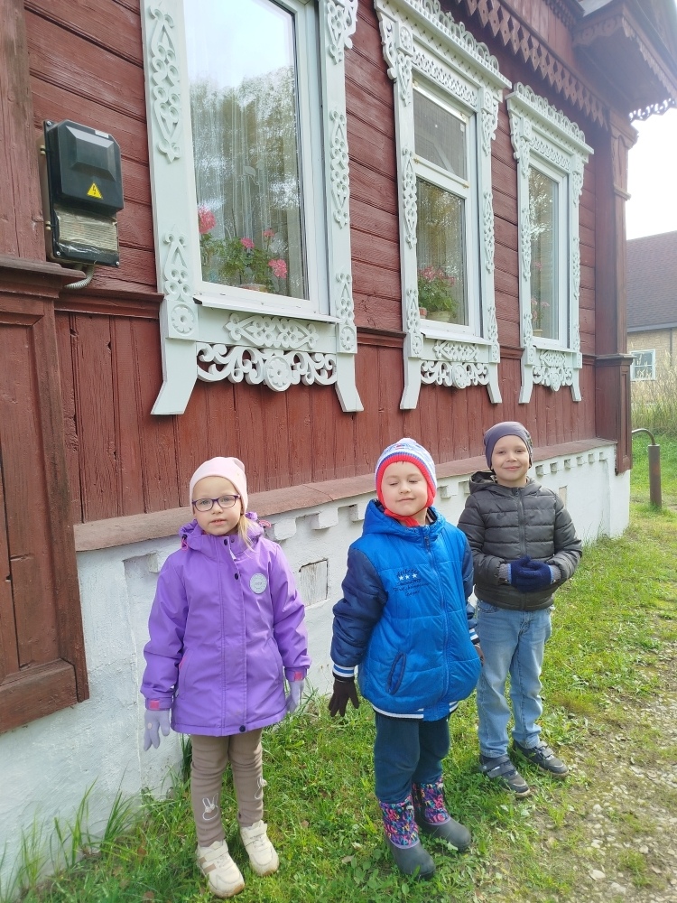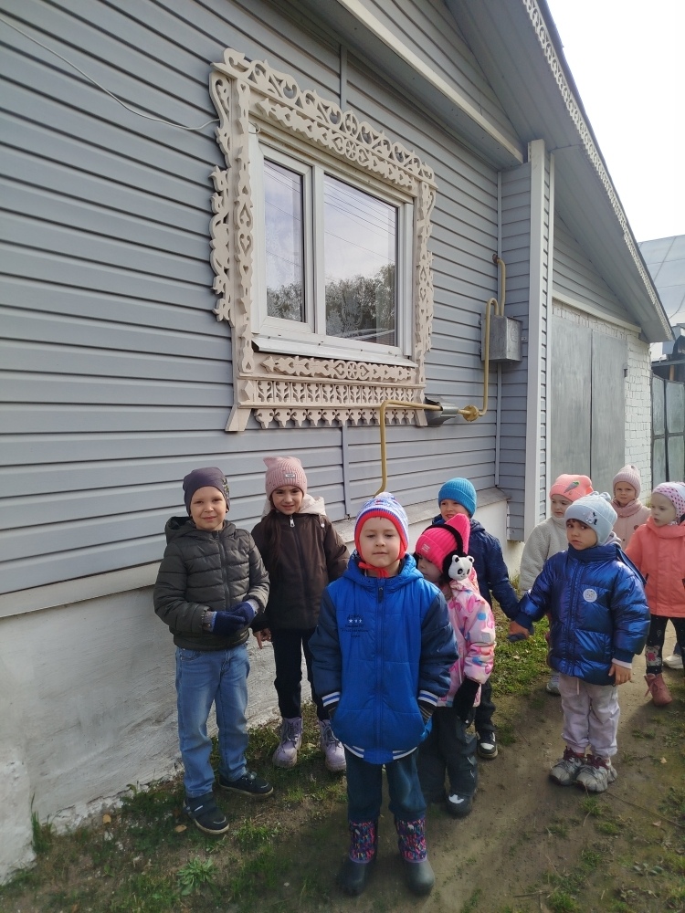 По дороге в рощу ребята рассматривали такие украшения домов, как наличники, а также услышали о них рассказ. На множестве домов мы не нашли даже двух одинаковых видов данных декоративных украшений.