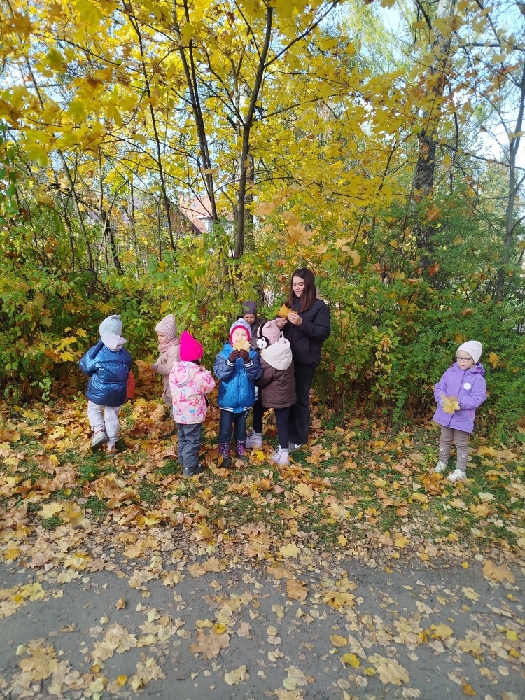 В ходе экскурсии дети любовались яркими красками осени, рассматривали деревья, сравнивали листья по форме, размеру, цвету, собирая их в красивые осенние букеты.