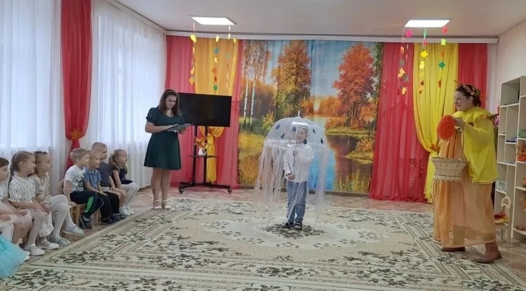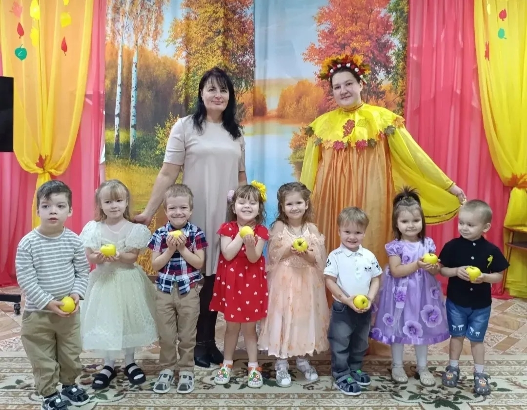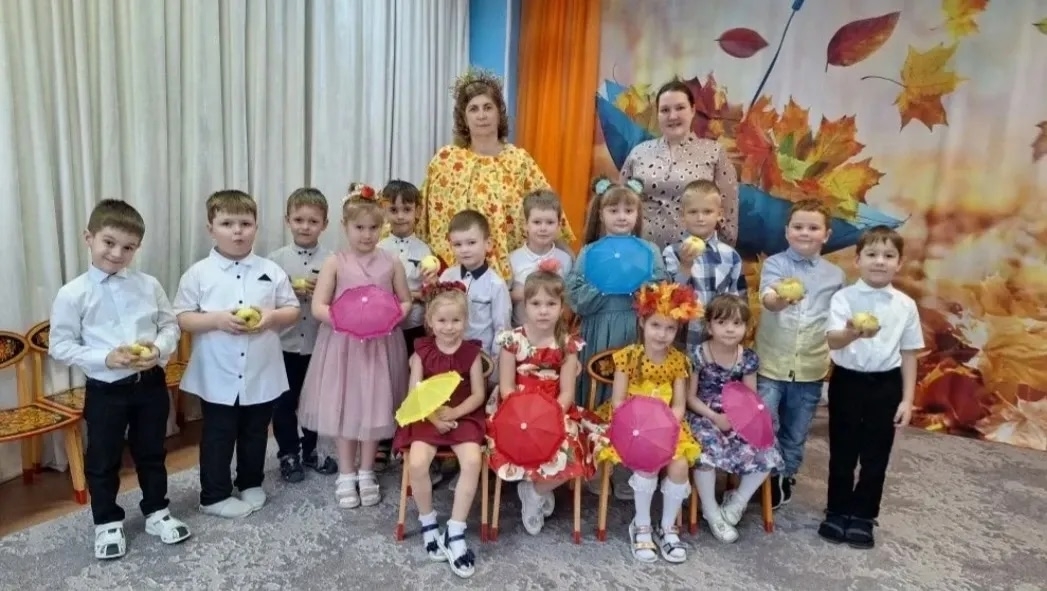 Повеселили детвору мальчик-дождик, огородное пугало. А самый яркий и запоминающийся эпизод — сюрпризный момент — гостинцы от красавицы Осени: корзинки с яблоками для всех ребят!