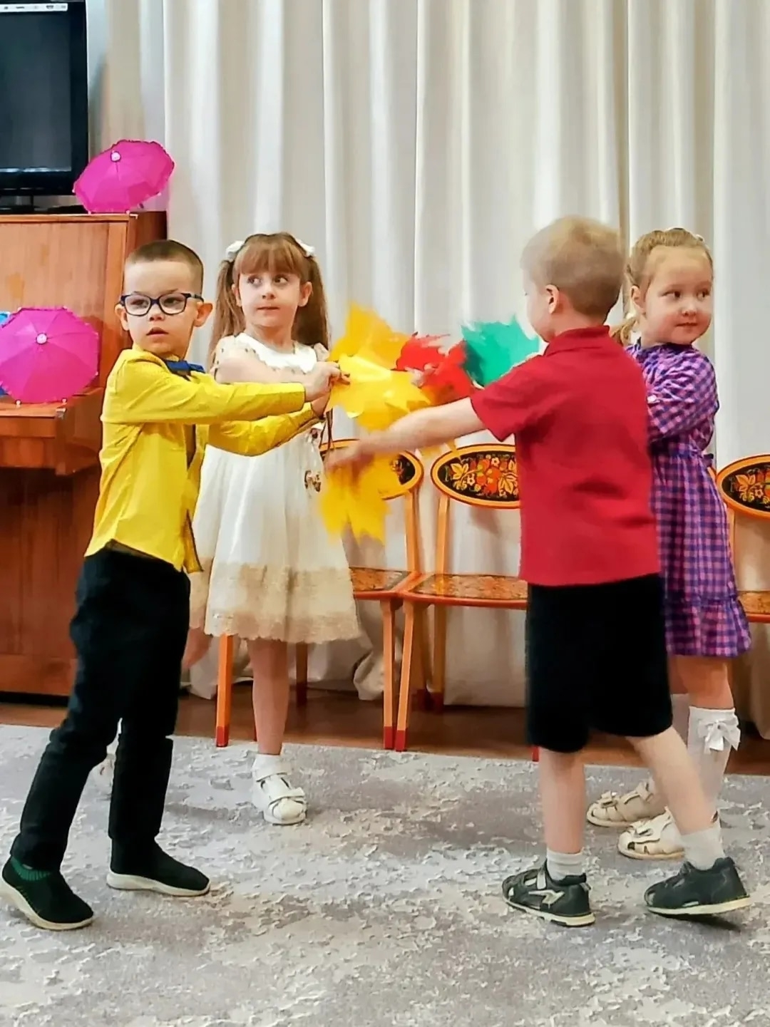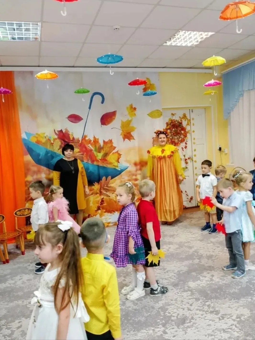 На утренниках дети поют песни, исполняют танцы, играют оркестром, отгадывают осенние загадки, рассказывают стихи, играют в подвижные игры.