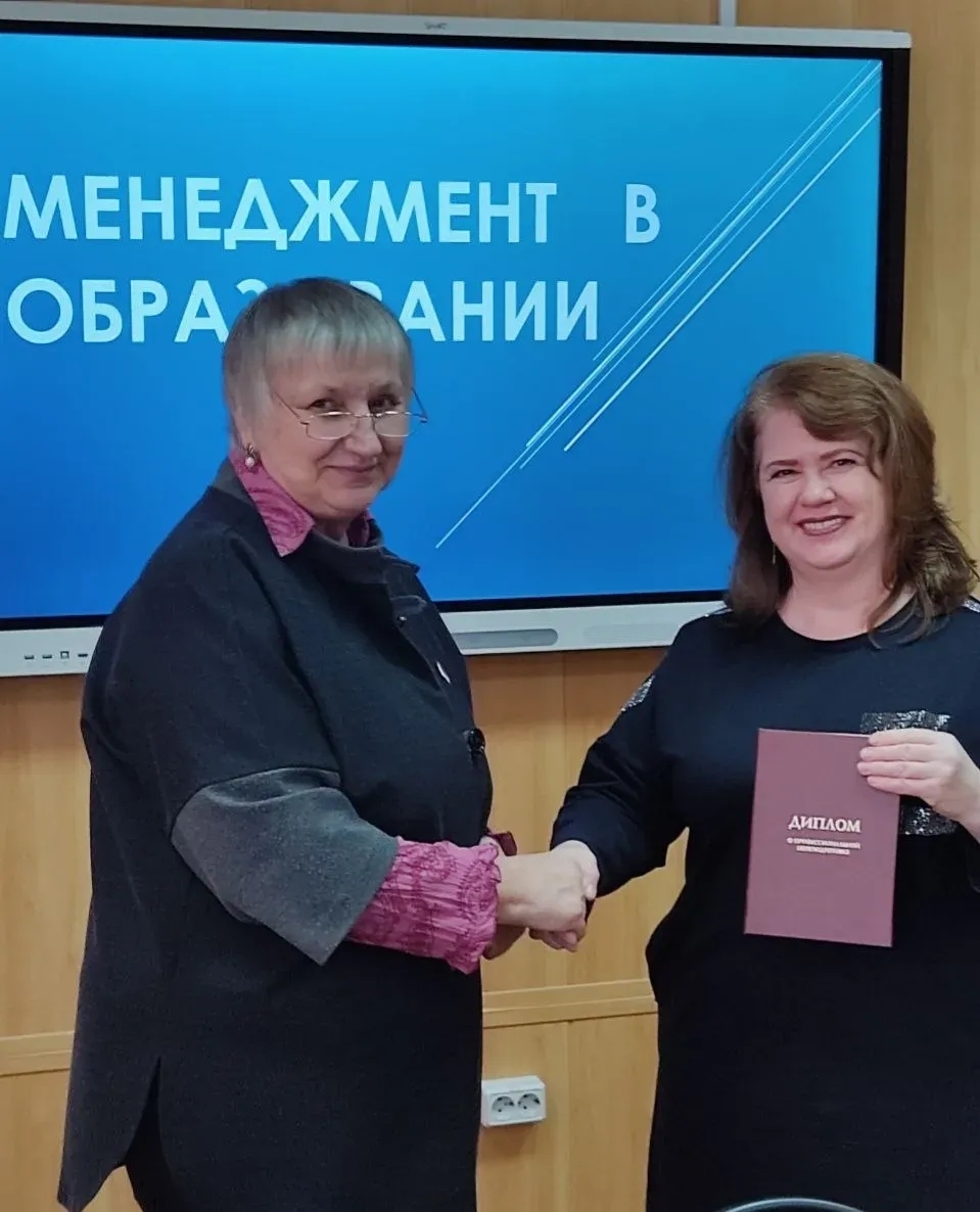 В Университете непрерывного образования и инноваций г. Иваново заведующий кафедрой управления образованием, заслуженный учитель РФ Иванова Елена Васильевна вручила диплом о профессиональной переподготовке руководителя Бабенко Ирине Юрьевне по профессиональной программе «Менеджмент в образовании». В процессе обучения руководители образовательных учреждений прошли школу научного и административного управления, направления деятельности руководителя, особенности регулирования трудовых отношений, изучили локально-нормативные акты, правовые аспекты образования, стратегическое и тактическое планирование системы менеджмента, прошли стажировку в детских садах и школах Ивановской области. Наталья Ивановна Кольчугина, доцент кафедры управления образованием, на практике научила психологической безопасности и жизнестойкости.