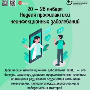 Период с 20 по 26 января Министерством здравоохранения РФ обозначен как «Неделя профилактики неинфекционных заболеваний». Рекомендуем ознакомиться с приложенным документом, а также с материалами портала https://www.takzdorovo.ru/zabolevaniya/